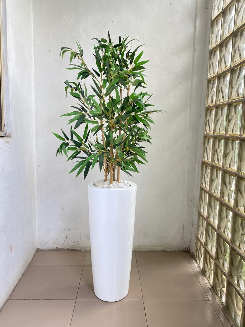 Our Artificial Natural Bamboo Tree potted in a cone-shaped fiberglass vase is a perfect combination of modern design and natural elegance, ideal for enhancing any space with a touch of greenery. The artificial bamboo tree mimics the tall, slender stalks and lush green leaves of real bamboo, offering a peaceful atmosphere without the need for maintenance. The cone-shaped fiberglass vase provides a sleek, minimalist base that complements the natural beauty of the bamboo while maintaining a contemporary look.