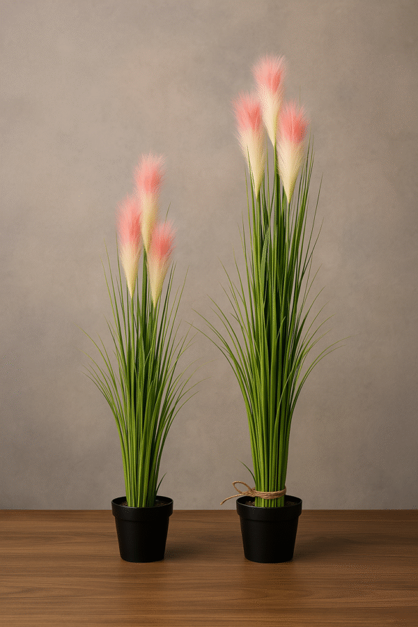 A standout feature of these faux plants is the soft, pink floral detailing that blends beautifully with the slender reed stalks. These petals offer a gentle color pop, adding freshness and softness to modern interiors. Moreover, they are arranged to look natural and unforced, making the plant feel lifelike.