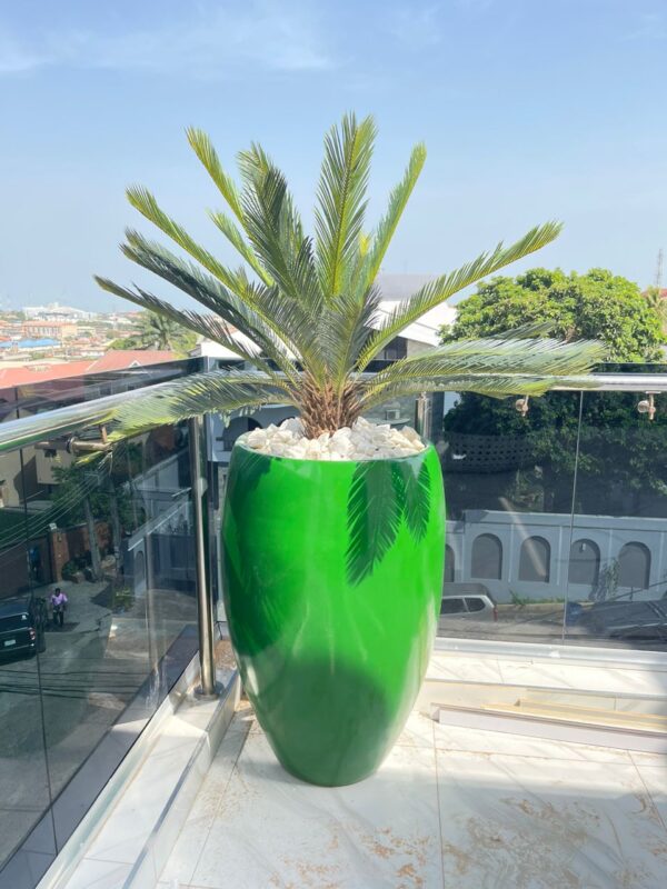 The classic fiberglass pot adds a touch of refinement, with its high-quality, durable construction that is lightweight and resistant to weathering, making it suitable for both sunny patios and elegant indoor spaces. Its timeless design complements the bold, arching fronds of the Cycas Palm, allowing the plant’s natural beauty to shine while adding a touch of modern sophistication to any decor style, from traditional to contemporary.