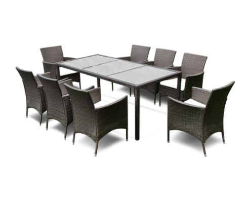 This is our 9 pieces brown rattan furniture set, including 8 chairs and 1 table, which is of high quality. This large furniture set is very practical and useful. If you own it, you can use it with a happy mood. Your families, friends or guests can sit on it pleasantly. It can not only make your outdoor life more comfortable, but also make your home more beautiful with its fashionable and modern style. It is made of rattan material and iron frame, which makes it sturdy and can serve you for a long time. Its beige seat cushions are really soft and they are water-proof. And the table provides you with enough storing space.Don’ t hesitate!