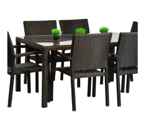 The Panama Rattan 6 seater Rectangular table garden furniture set consists of a rectangular table and Six stacking armless chairs, made from Viro Prussian bronze rattan. The table has a glass top made from tempered glass.