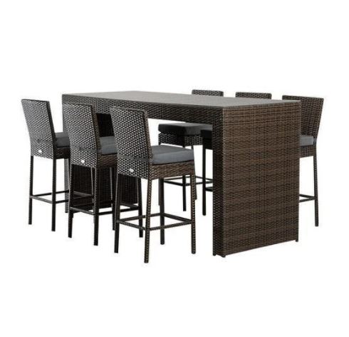 Durable brown weatherproof flat rattan covers the strong aluminium frame of the Genua Outdoor Bar Table Set. A rectangular clear glass table top provides ample space for your entertaining needs. Set includes a table, six chairs and no cushions.